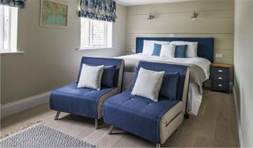 This room contains a King Double bed, a 3’ single bed and a fold down 3’ single bed giving a capacity of 4. It is located on the second floor and looks out directly over the river and has wonderful views. Slight noise can be heard from the pub below and some noise can be heard on Friday nights when there is a band.